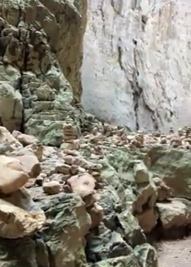 The video showcases a large cave with towering walls of light-colored rock. The floor is covered in grey and green rocks, and numerous small stacks of stones are scattered throughout the space. In the background, figures of people can be seen. The camera gradually tilts upwards to reveal openings at the top of the cave, allowing sunlight to stream in. The rock walls display vertical striations, suggesting water or other natural erosion.