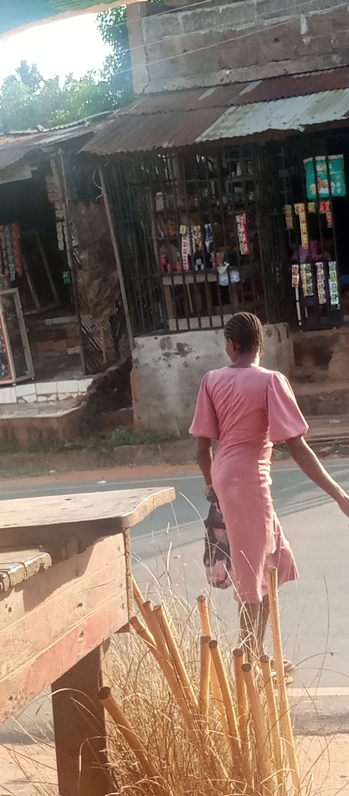 A woman in a pink dress walks past a roadside kiosk. The kiosk has a corrugated iron roof and a metal-barred window displaying various items for sale. She carries a bag in her left hand. A wooden structure stands in the foreground. Thin, yellow-painted posts emerge from dry grasses near the road's edge. The overall scene suggests a warm, possibly tropical, location.
