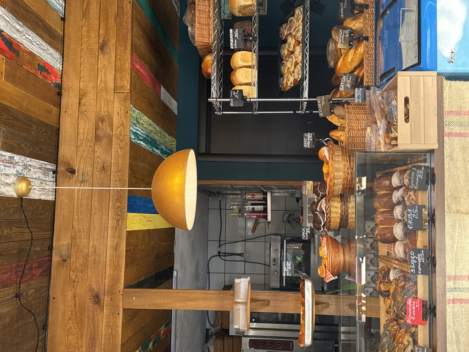 The image depicts the interior of a bakery or cafe in Slobozhanske, Ukraine