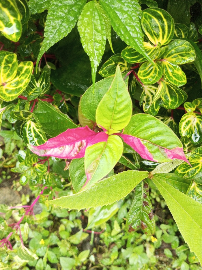 A close-up captures a vibrant mix of foliage. Lush green leaves dominate, with some showing a yellow vein pattern. A striking plant features leaves with pink edges transitioning to green centers. Water droplets glisten on the leaves, indicating recent rain. Smaller green plants with tiny yellow flowers fill the lower ground. The scene suggests a well-hydrated and diverse garden.