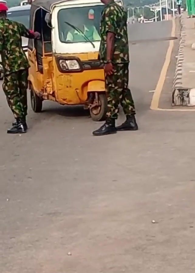 two men in camouflage uniforms and red berets standing next to a yellow motorized tricycle in the middle of a road. The tricycle appears to be stopped, and a person is seated inside. A silver car drives slowly behind the soldiers and tricycle. Other people in civilian clothing are visible walking on the side of the road and in the background. The scene is outdoors, likely in a suburban or rural setting, with a hill visible in the distance.