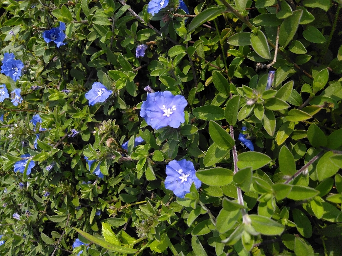 The image depicts a dense, close-up view of a flowering plant, presumably located in Dulce Nombre de Jesús, Costa Rica, though no specific city landmarks are visible. The scene is dominated by vibrant green foliage and numerous small, trumpet-shaped flowers. The flowers are a consistent blue-purple coloration with a distinct white or pale center, typically displaying five fused petals and measuring approximately 2-3 centimeters in diameter. The leaves are ovate to elliptical, bright green, and densely cover thin, branching stems that exhibit a reddish-brown to greenish-brown hue and some visible hair-like texture. The lighting is bright and natural, indicating an outdoor environment. No people, animals, man-made structures, or other discernible objects are present in the frame. The primary action observed is the natural growth and blooming of the plant species.