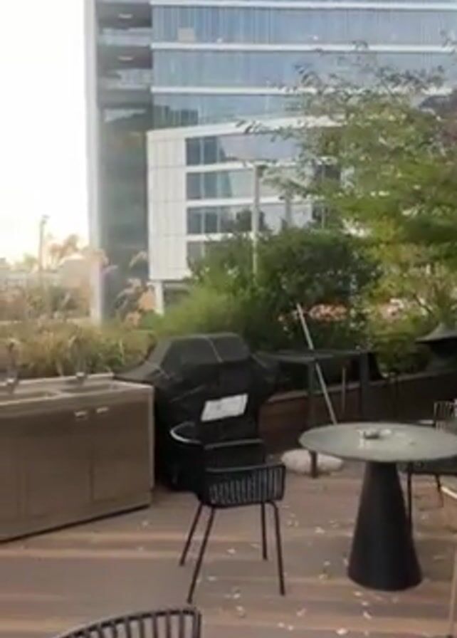n outdoor terrace with tables, chairs, a grill, and a stainless steel outdoor kitchen setup. Tall buildings surround the terrace. There are bushes and other greenery planted on the terrace. Beyond the terrace are buildings, streets, and traffic. A black dog runs through the street. The sun shines brightly and the video is taken in daylight.