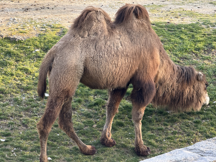 - "A brown, two-humped Bactrian camel with thick, shaggy fur stands on all four legs, facing right, with its head lowered towards the ground" by FM-QK5pm1, licensed under CC BY 4.0
