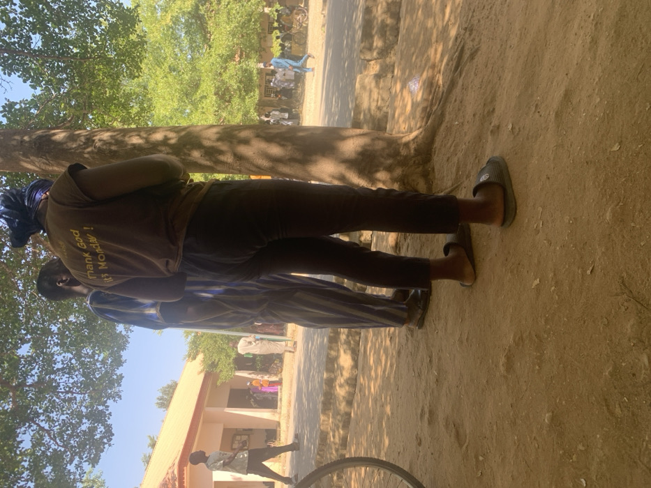 The image depicts an outdoor scene in the city of Dabawa, Nigeria, under clear skies with bright sunlight casting distinct shadows