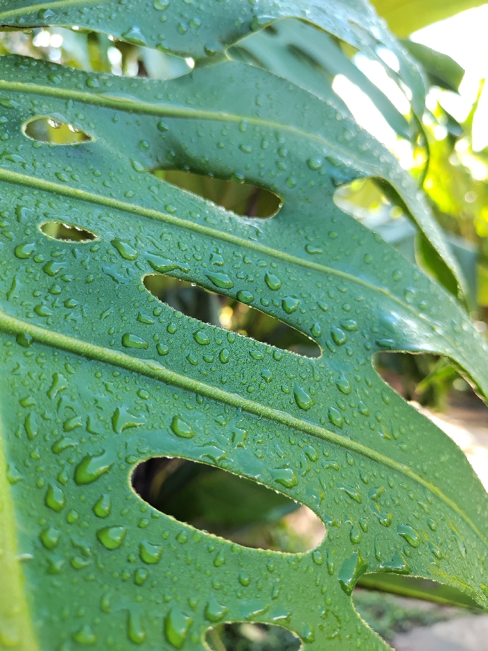 - "The image displays a close-up, high-angle view of a large, vibrant green leaf, likely from a Monstera plant, characterized by distinct natural fenestrations (holes and deep lobes) running parallel to the central vein structure" by FM-WroXJ3, licensed under CC BY 4.0