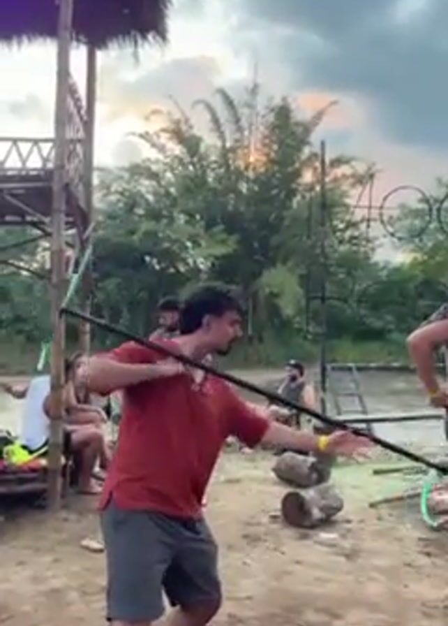 man performing a poi dance on a sandy riverbank. He's wearing a red shirt and grey shorts, twirling a long stick with glowing green and grey blades on either end. Several other people are present. Some are seated on makeshift chairs under a bamboo structure, while others stand nearby. The background reveals a river flowing gently and lush vegetation, with the sky displaying the colors of a setting sun. A metal frame spelling "ZOO" is visible further behind.
