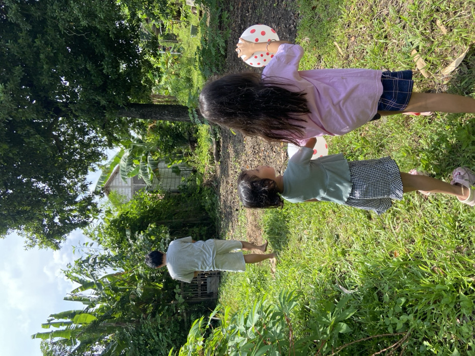 Two girls stand in a grassy area, one holding a polka-dot balloon. The taller girl wears a purple top and denim shorts; the shorter one wears a green top and patterned skirt. Behind them, a man in a gray shirt and light shorts walks barefoot. Trees and lush greenery surround them. A house is partially visible in the background. The scene is bathed in sunlight.