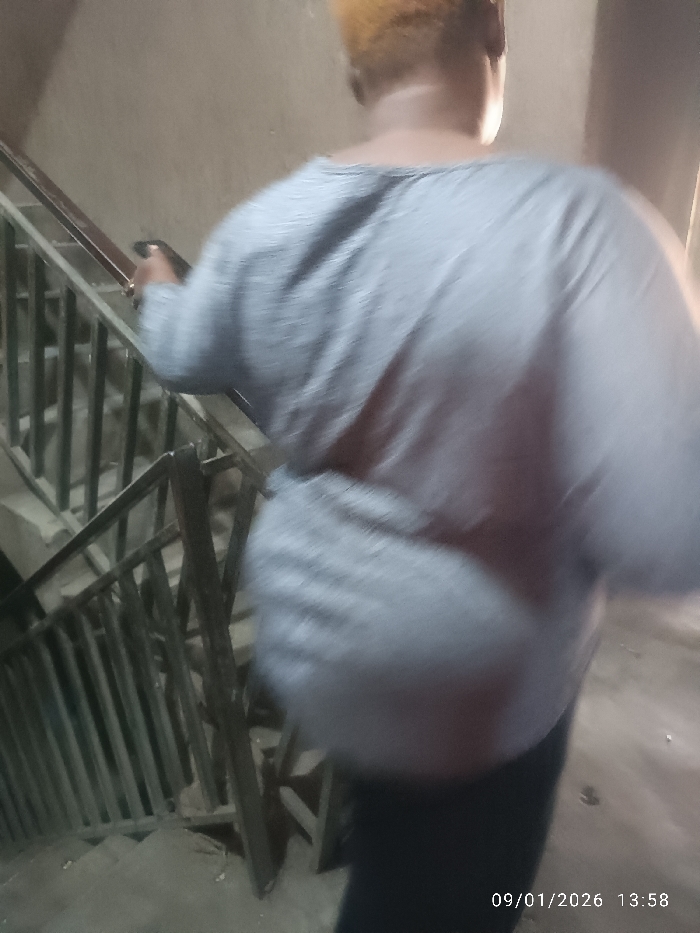 n individual, viewed from behind, navigating a concrete staircase within a building located in Sabon Gari East, Nigeria. The person has light-colored, possibly dyed, hair and is wearing a light-grey, textured, long-sleeved top and dark trousers. Their right hand holds a dark object, consistent with a mobile phone, and rests on a dark-colored metal handrail with vertical balusters. The staircase walls are plain and light-colored. The scene is dimly lit. A timestamp visible in the lower right corner reads "09/01/2026 13:58". The subject's motion contributes to a slight blur in the photograph.