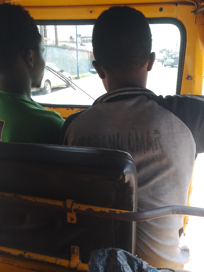 Inside a yellow auto rickshaw, two individuals are seated. One wears a green shirt, facing towards the street visible through the open window, where a white car is parked. The other, wearing a grey shirt, faces the camera, with the name "KUNO UMAR" printed on the back. A dark, worn-out seat is in the foreground. The rickshaw appears to be moving along a street, indicated by the visible vehicles and buildings outside.