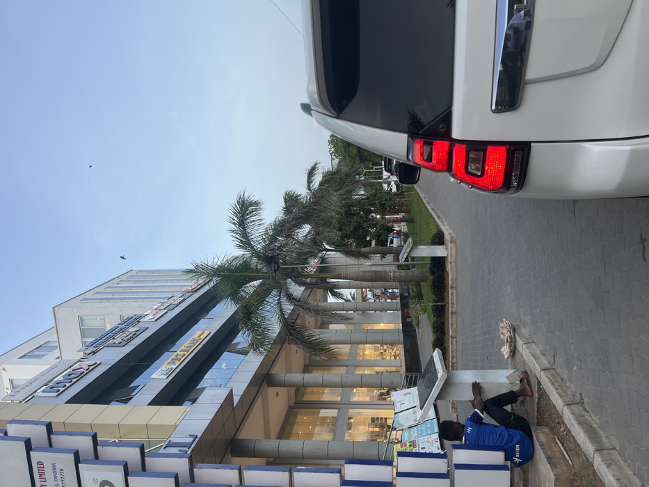 The image displays an urban outdoor scene in Zanzibar, Tanzania. The sky is clear and light blue, indicating daylight. In the left foreground, a male individual, dressed in a blue long-sleeved shirt with white text and dark trousers, sits on a low concrete curb. He leans against a white display stand with an angled top. A circular tray containing multiple food items rests on the paved ground next to him. Behind this individual is a multi-story commercial building with a modern glass and light-colored facade. Visible signage on the building includes "MAX" and "PEZ BANK." A partially visible vertical sign panel on the far left confirms the location as "ZANZIBAR." The ground floor features large glass windows, revealing a brightly lit interior. A landscaped strip with several tall palm trees and smaller plants runs alongside the paved pedestrian area in front of the building. On the right side of the image, the rear section of a white SUV is parked, its red taillights illuminated. The vehicle features a dark-tinted rear window and a chrome trim piece above the bumper. Further down the street, additional vehicles are visible. Two small, dark birds are present in the upper portion of the sky.