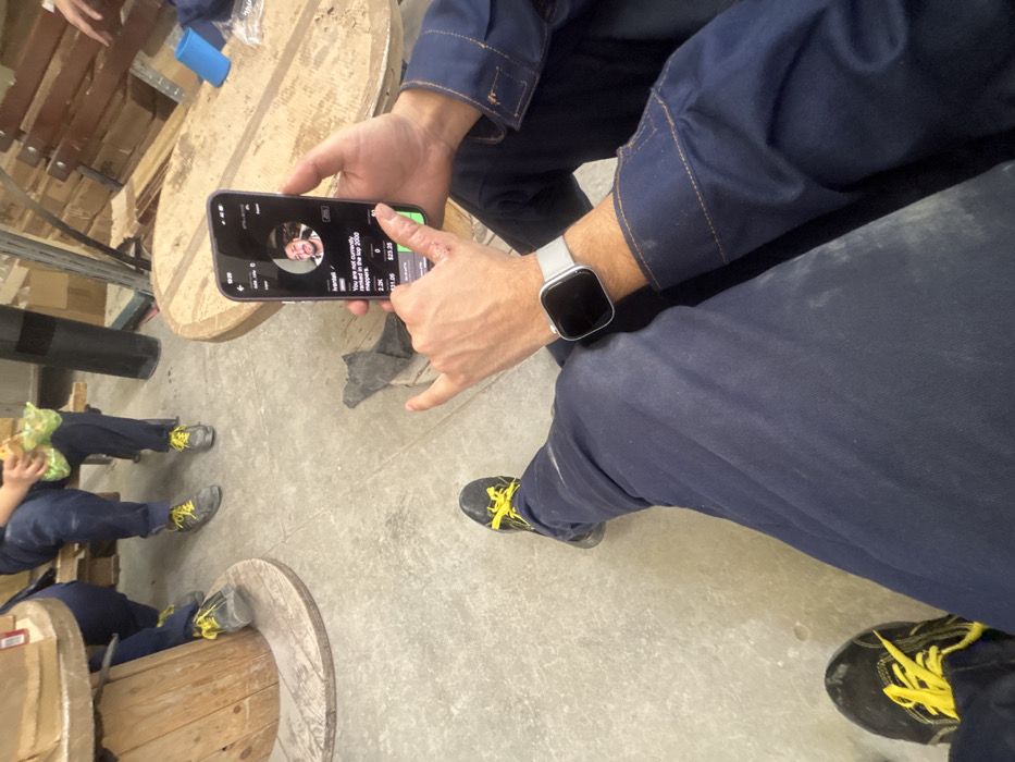 The image depicts an indoor industrial or workshop environment located in Sevlievo, Bulgaria. The flooring is light gray concrete, showing minor wear. In the immediate foreground, a person is seated, wearing dark blue work pants and a long-sleeved dark blue work shirt with light brown stitching details. A light gray smartwatch with a dark, inactive screen is visible on their left wrist. Their right hand holds a dark-colored smartphone vertically, displaying a profile page within an application. The screen shows a male profile picture, the username "ivantaii," and the text "You are not currently ranked in the top 5000 mappers." Below this, numerical data includes "2.2K," "$31.06," "0," and "$23.25." The phone's time is 10:20. The person's left hand, showing a small abrasion or cut near the base of the index finger, has its index finger extended and touching the phone screen. The person's left foot, wearing a dark shoe with bright yellow laces, is visible at the bottom left. In the mid-ground, multiple other individuals are partially visible, primarily their lower bodies. They are similarly dressed in dark blue work pants and dark shoes with bright yellow laces, suggesting a uniform. One person on the left is seated behind a large wooden cable spool, which is repurposed as a table, and is holding an object wrapped in green plastic or foil, indicative of eating. Another person's leg and arm are visible on the right, adjacent to a second large wooden cable spool used as a table, where a blue container is also present. The background features stacked wooden planks or pallets, indicating material storage, and a dark cylindrical object. A metal rack or shelving unit is partially visible on the far right.