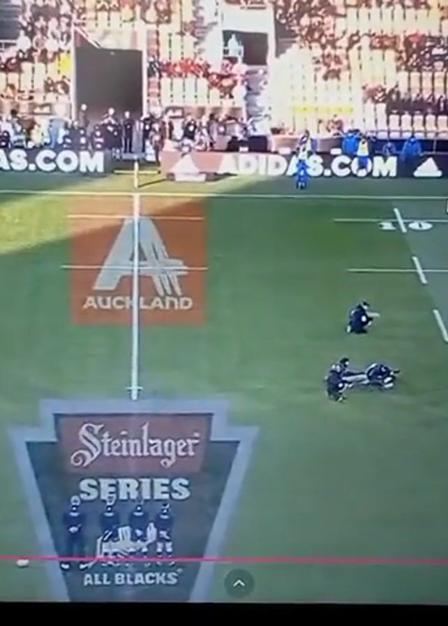 Here's a detailed description of the video: The video shows a rugby match on a sunny day. The field is green with white lines and markings. On either side of the field, teams in contrasting jerseys (one team in blue and the other in black) stand facing each other. Spectators are visible in the stands behind the field. The "Steinlager Series" logo is prominent at the bottom of the screen. The video transitions to a close-up shot of the team in black uniforms. They are performing a haka, a traditional Māori dance. The players are expressive, with intense facial expressions and strong, synchronized movements. The uniforms have the Adidas logo and "AIG" printed on them. The team's footwear is mostly white with orange accents. They are on a green field. The background shows a bright sky with some clouds.