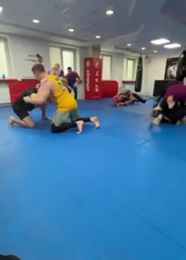 martial arts training session taking place in a brightly lit gym with a blue mat covering the floor