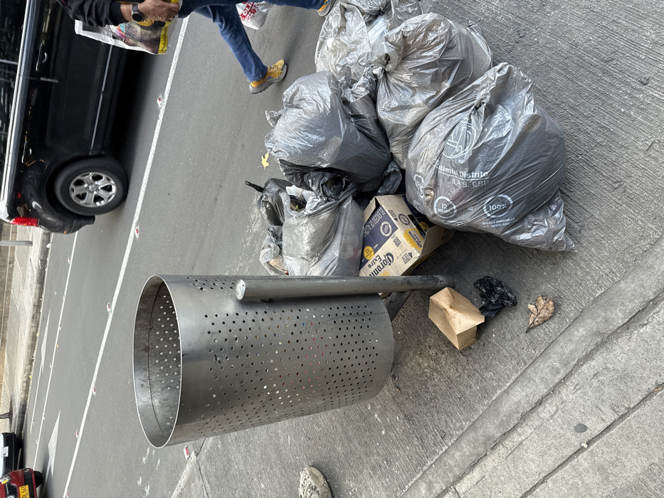 A cylindrical, perforated metal trash can lies on its side on a gray asphalt surface. A pile of large, gray trash bags, some labeled in Spanish, sit behind it. A discarded Corona beer box and scattered trash are nearby, including a small brown paper box and a leaf. A black car is partially visible to the left, along with a person wearing jeans and sneakers, holding a bag. White painted parking lines mark the pavement.