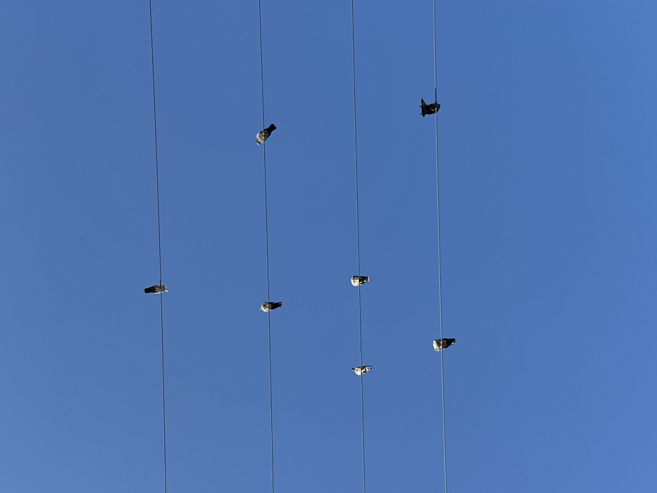 - "This image, captured in Beit Yitshak Sha'ar Hefer, Israel, depicts seven birds perched on four parallel utility wires against a clear, unclouded blue sky" by FM-RIphO2, licensed under CC BY 4.0