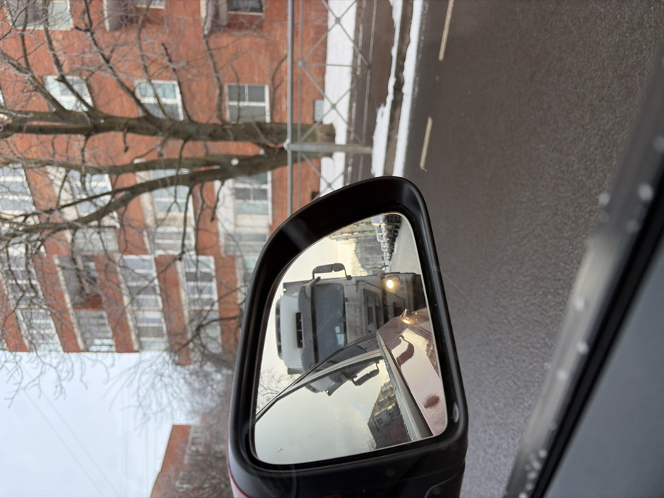 The scene depicts a winter street in the city of Kronstadt, Russia, viewed from inside a vehicle. The foreground shows a dark gray-black window frame and the red painted exterior of the vehicle, partially obscured by a side-view mirror. Small droplets of water or ice are visible on the window and mirror housing. The side-view mirror reflects a light-colored (likely white or light gray) multi-axle truck, possibly a KAMAZ, approaching from behind. Its single illuminated headlight casts a yellow glow. The mirror also shows a line of dark-colored cars parked parallel to a wet asphalt road that stretches into the distance, under a bright, hazy sky. A reflection of the vehicle's red body and another building is visible within the mirror to the left of the truck. Outside the mirror, the mid-ground features a wet, dark asphalt road with two faint, dashed white lane markings on the right. Adjacent to the road, a strip of dirty snow covers the curb and ground, behind which a low, white, metal fence with criss-cross patterns is visible. Behind the fence, several bare deciduous trees with intricate branch structures stand in front of a prominent red-orange brick residential building. This multi-story building, characteristic of Soviet-era architecture, has numerous rectangular windows with white frames and some enclosed balconies. In the background, on the far left, another similar red brick building is partially visible. The sky above is overcast and light gray. No people are visible in the scene.