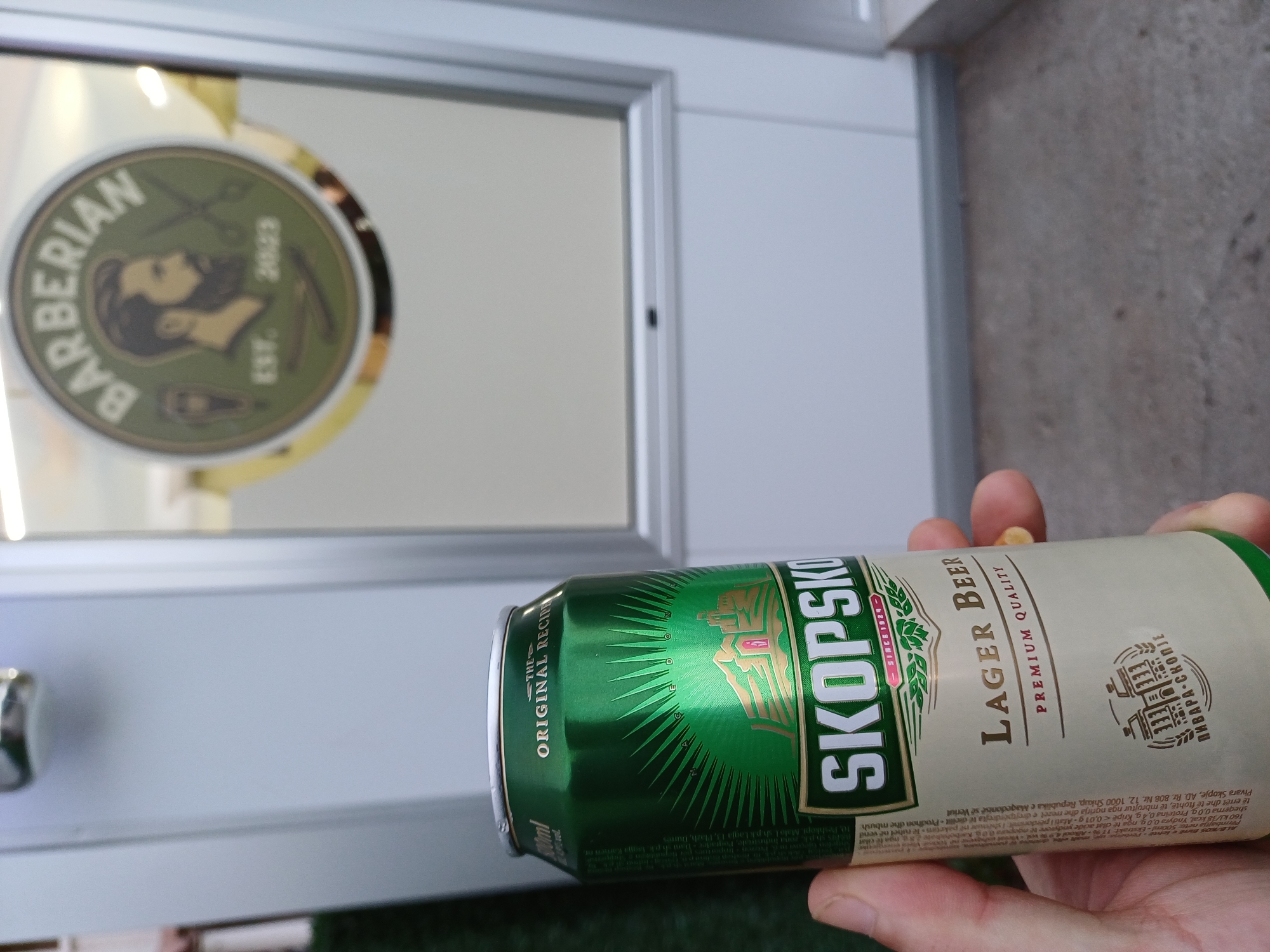 A human hand is prominently positioned in the foreground, holding a 500ml Skopska Pivara "SKOPSKO" Lager Beer can. The can is green and cream-colored, displaying text such as "THE ORIGINAL RECIPE," "PREMIUM QUALITY," "SINCE 1924," and "ПИВАРА СКОПЈЕ" (Brewery Skopje). The scene is located in Gevgelija, North Macedonia. In the background, a light-colored storefront door or window is visible, featuring a circular green and brown logo. This logo depicts a bearded man in profile, flanked by a straight razor and scissors, with the text "BARBERIAN" and "EST. 2023." The ground surface in the lower portion of the image consists of dark grey concrete, with a patch of green artificial turf visible to the far left.