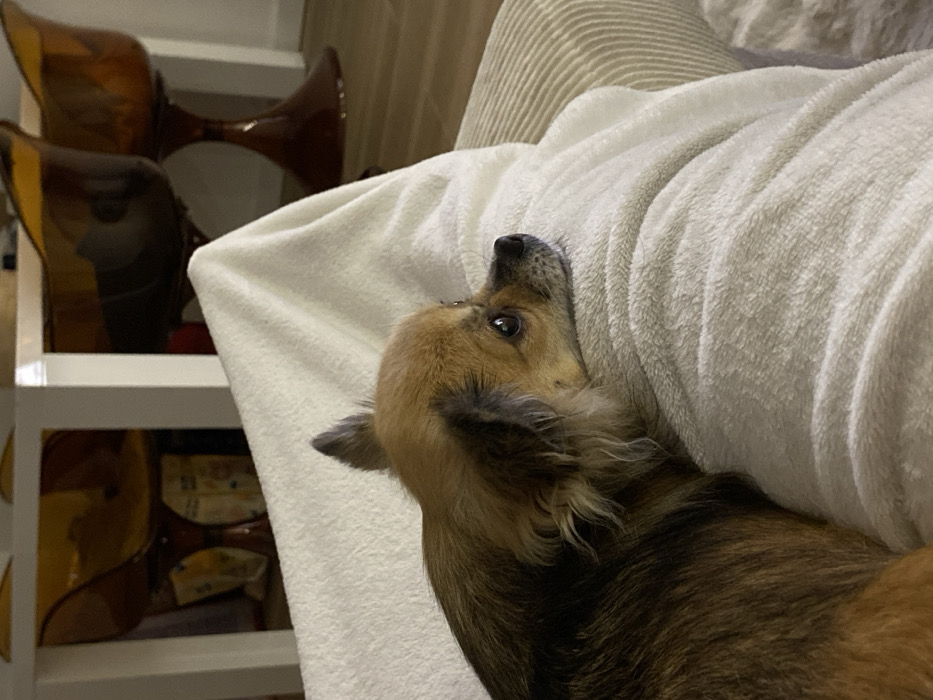 An indoor scene in Erstein, France, features a long-haired Chihuahua-type dog. The dog is positioned in the foreground, lying on a light beige or cream-colored plush blanket that covers a ribbed, light-toned fabric surface, likely a sofa or armchair. The dog exhibits brown and tan fur with darker brown and gray areas, particularly on its head and ears. Its head is resting on the blanket, turned towards the right side of the frame, with its dark, round eyes looking in that direction. One ear is partially erect, and the other is slightly folded. In the mid-ground, behind the dog and the blanket, a white rectangular structure is visible, likely a table leg or support. Beyond this, two modern chairs are present, featuring dark, translucent, possibly amber-colored bucket seats on brown, tulip-shaped pedestal bases. The background includes a light-colored floor. The overall lighting suggests an interior setting, possibly under artificial illumination.