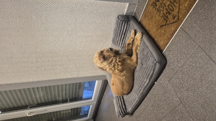 - "A tan-colored Cocker Spaniel is positioned centrally within an interior space in Melle, Belgium, lying on a rectangular, ribbed gray pet bed with elevated bolsters" by FM-vGj3T2, licensed under CC BY 4.0