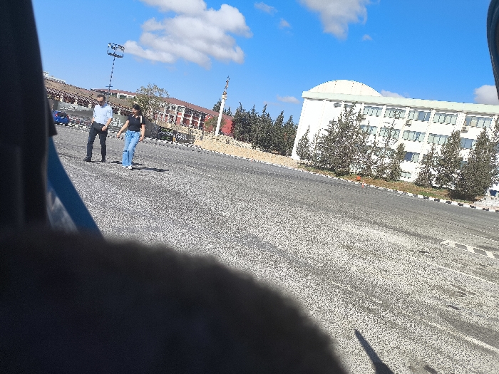 This outdoor, daytime image depicts a scene on the Near East University campus in Kızılbaş, Northern Cyprus / Cyprus, under a clear blue sky with scattered white cumulus clouds. The foreground is partially obscured by a dark, blurry, amorphous object, suggesting the photograph was taken from a vehicle or behind a barrier. In the middle ground, two individuals are observed walking from left to right across a broad, textured dark grey asphalt surface. The individual on the left is a male, wearing a light blue collared shirt, dark trousers, and dark shoes. The individual on the right is a female, dressed in a dark t-shirt, light blue jeans, and white shoes. Both appear to be moving in the same direction. The background features prominent structures and vegetation. To the right, a multi-story white building with a distinctive curved, light-colored roof is visible, characterized by numerous rectangular windows, many equipped with external air conditioning units. Several small, green coniferous trees are planted in front of this building. Further to the left and rear, a complex of reddish-brown, multi-story buildings with multiple windows is present. A tall pole featuring a square light fixture stands in the background, between the building complexes. A partial view of a decorative stone or concrete monument is visible in the mid-left background. A dark blue vehicle is partially visible behind the two walking individuals on the left. Shadows are cast towards the left and foreground, indicating the sun's position.