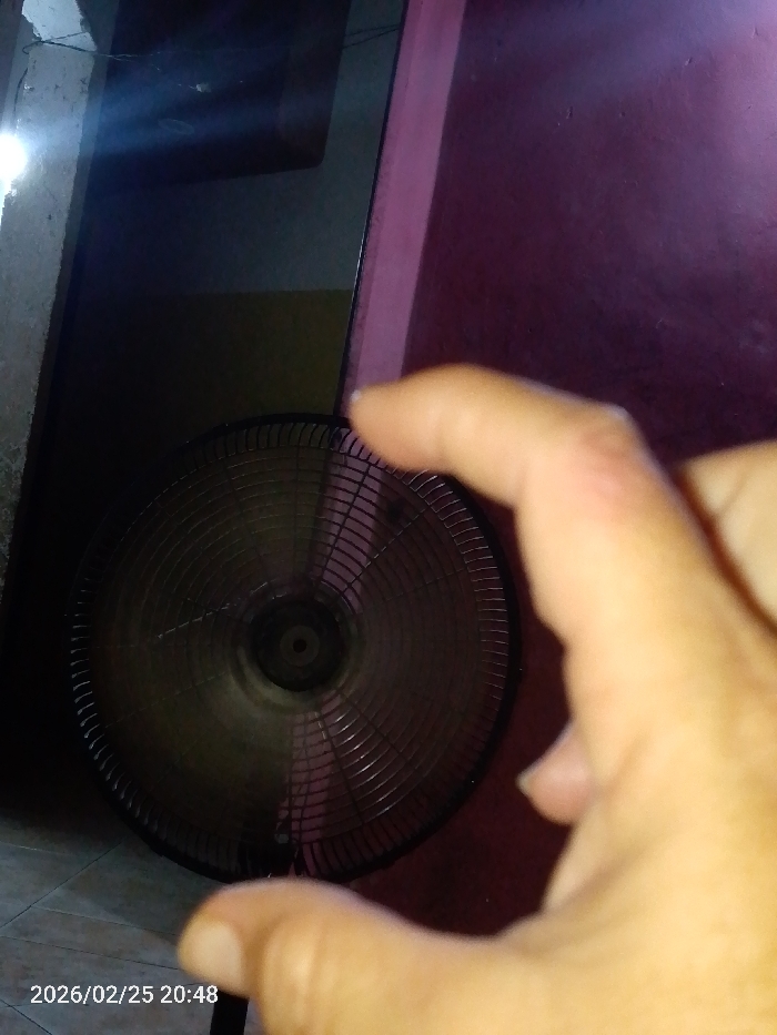 The image depicts an indoor scene in the city of Unknown, Unknown, captured on 2026/02/25 at 20:48. A light-skinned human hand, blurred and out of focus, occupies the immediate foreground, positioned from the bottom right towards the center, partially obscuring a dark-colored standing fan. The fan's protective grille is visible, and its blades appear to be in motion, indicated by motion blur. The floor in the lower left consists of light-colored tiles. To the right of the fan, a dark pink or maroon wall is visible. In the upper left background, a wall of a lighter, possibly yellowish, hue is partially visible, leading into a darker area, with a bright light reflection present in the far upper left corner. The scene is dimly lit.
