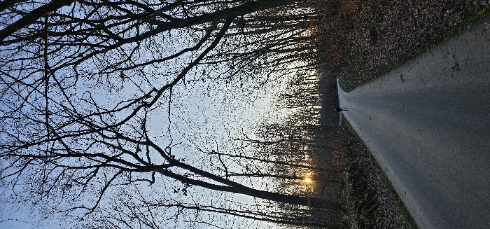 The image displays a paved road traversing a deciduous forest located in the Junglinster area of Luxembourg. The road, which is dark gray and unmarked, extends into the distance, gently curving towards the right. Bare trees with dark branches line both sides of the road, silhouetted against a light blue sky with minimal cloud cover. The ground bordering the road is covered with fallen brown leaves and scattered green undergrowth. A single individual, dressed in dark clothing, is visible in the far distance, positioned centrally on the road. The sun, low in the sky, is partially obscured by trees on the left side, emitting an orange glow. The environment indicates either late autumn or winter conditions during sunrise or sunset.