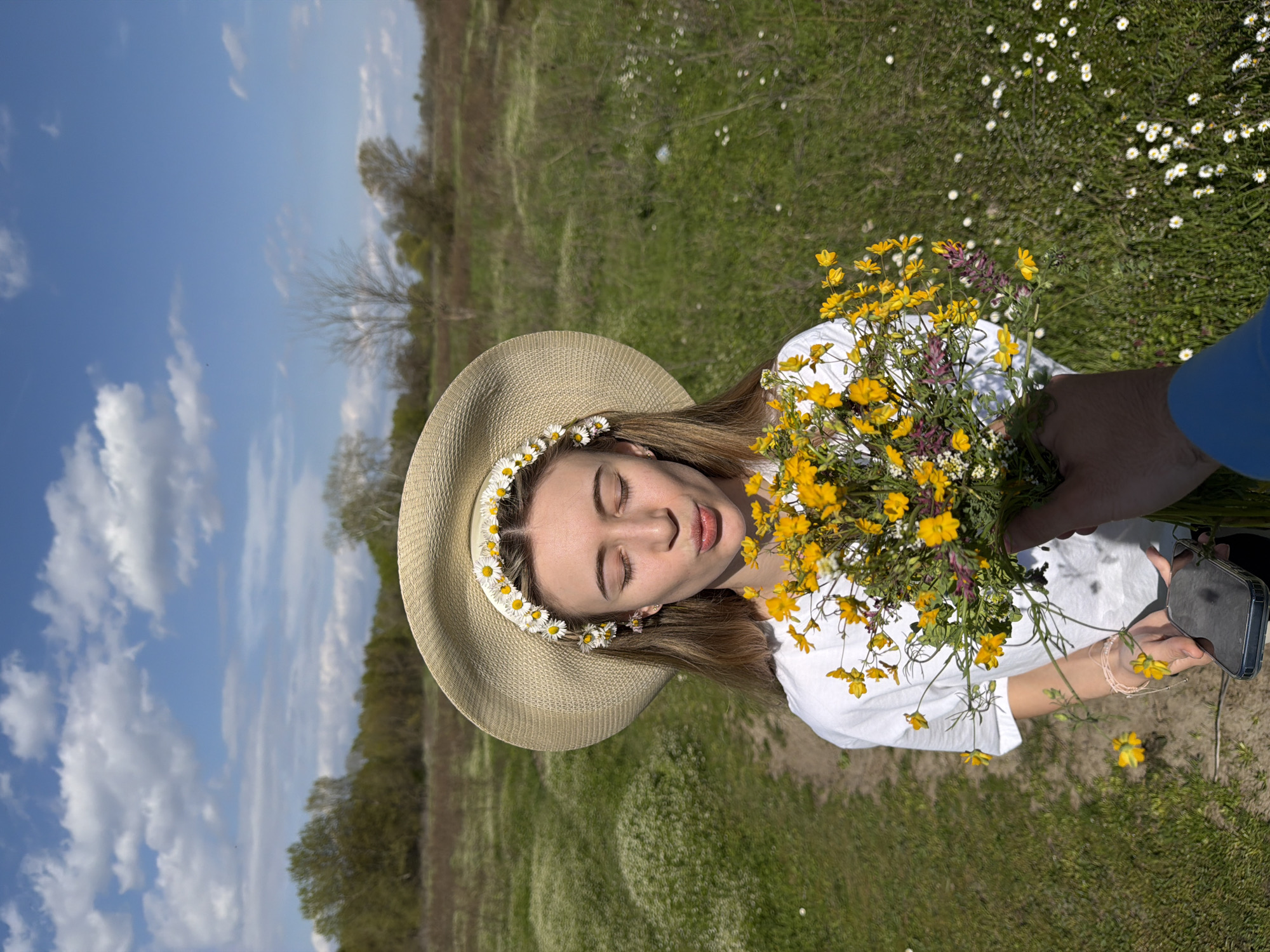 - "A woman wearing a wide-brimmed hat adorned with daisies lies on the ground, holding a bouquet of yellow wildflowers" by FM-69N2F2, licensed under CC BY 4.0
