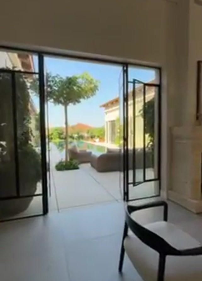 The camera moves forward through a set of large, black-framed glass doors opening onto a courtyard. The courtyard features a swimming pool with brown outdoor furniture next to it, as well as a tree in the center. The courtyard is surrounded by buildings with Mediterranean architecture. Inside the room, a light-colored chair with black wooden arms sits to the right of the open doorway. A stone fireplace is on the right. The overall impression is of a luxurious, tranquil setting.