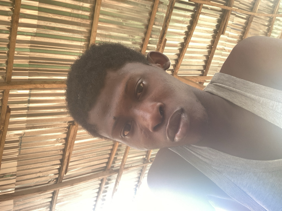 A young male, possibly in his late teens or early twenties, with dark skin and short, dark, curly hair, is depicted in a close-up, selfie-style photograph