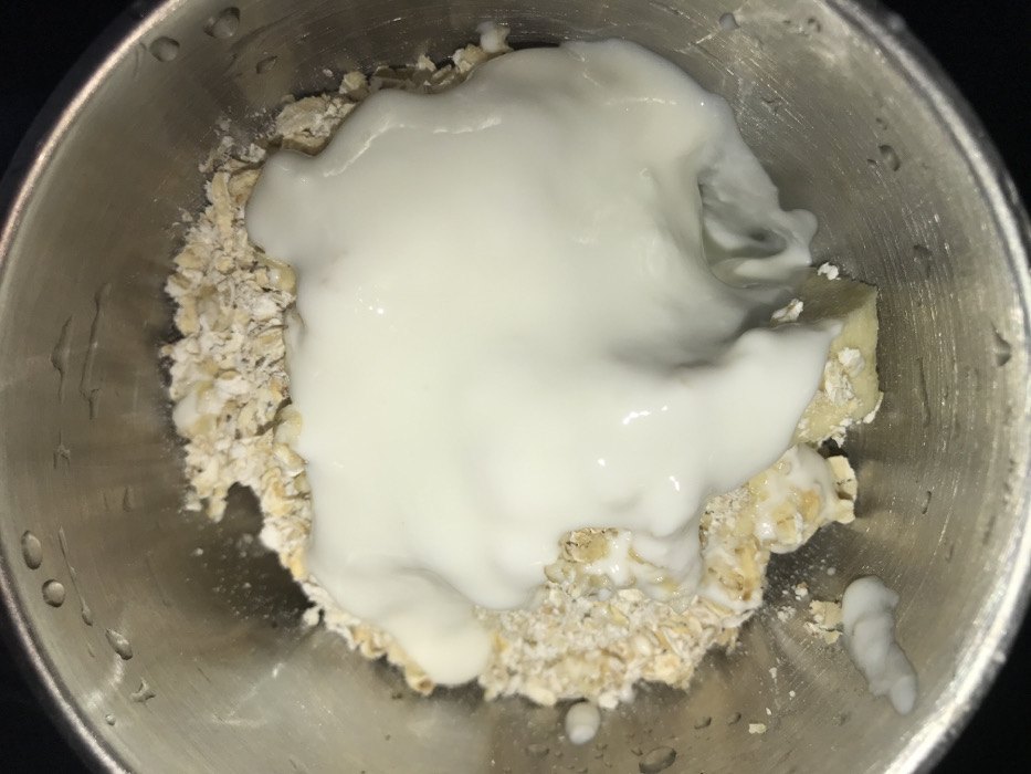 An overhead, close-up view depicts the interior of a metallic bowl, likely stainless steel. The bowl contains a mixture of ingredients: a base of dry, light brown rolled oats is visible, interspersed with several pale yellow, irregularly shaped pieces consistent with sliced banana. A thick, white, viscous substance, identified as yogurt, is poured centrally over the oats and banana, partially covering them. Small droplets of the white substance are observable on the interior surface of the bowl's rim. The background outside the bowl is dark and indistinct. This scene is located in Galadimawa, Nigeria.