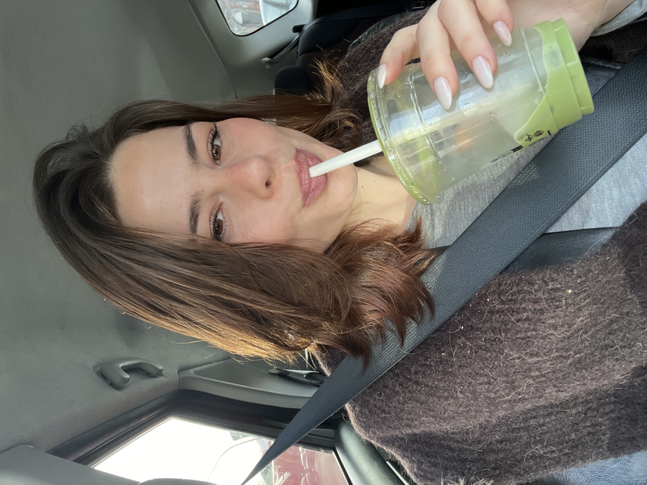 A female individual is depicted in the front passenger seat of a vehicle in Tourcoing, France. She has brown, shoulder-length hair and is looking directly at the camera. She is wearing a grey shirt under a dark brown, fuzzy cardigan, with a dark seatbelt secured across her right shoulder and chest. Her lips are pursed around a white plastic straw, from which she is drinking a green liquid contained in a partially consumed clear plastic cup with a green base and lid. The cup is held in her left hand, which displays manicured nails with light, translucent polish. Natural light illuminates the scene from the left side of the vehicle. The interior features a light-colored headliner and dark trim. The background visible through the vehicle windows is blurred, showing indistinct urban elements, including hints of red objects on the left and structural forms on the right.