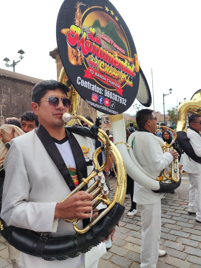 A group of men in white suits play tubas in a public square. The man in the foreground wears sunglasses and a black-trimmed suit. His tuba has a large sign attached that reads "La Monumental del Cusco Peru" and lists contact information. The background includes other musicians, cobblestone paving, and buildings. The scene conveys a sense of cultural performance and musical tradition in a Peruvian setting.