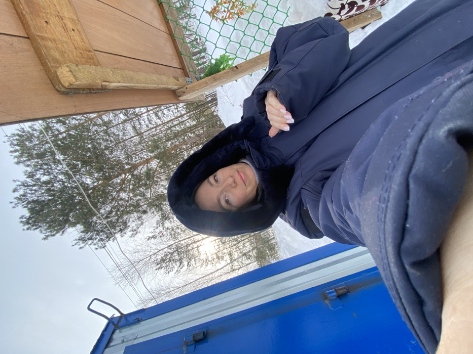 Location: Ol'khovskoye, Russia. The image depicts a female individual taking a selfie outdoors in a snowy, winter environment. The subject, a Caucasian female with dark hair, wears a navy blue insulated winter parka with a dark fur-lined hood. Beneath the parka, a light grey or white turtleneck sweater is visible. She looks directly at the camera with a neutral expression. Her right hand, displaying light pink nail polish, is positioned near her upper chest. To the subject's left is a bright blue metal structure, likely a container or utility box, featuring a vertical white stripe and a visible metal latch. To her right, a wooden overhead structure, constructed from planks and beams, is partially visible. Below this wooden structure, a green mesh net is present, intertwined with artificial reddish-brown foliage, resting on the snow-covered ground. The ground throughout the scene is blanketed in white snow. The background reveals a dense forest composed primarily of tall coniferous pine trees and some bare deciduous trees under a bright, overcast sky. Utility lines are visible stretching across the sky above the trees.