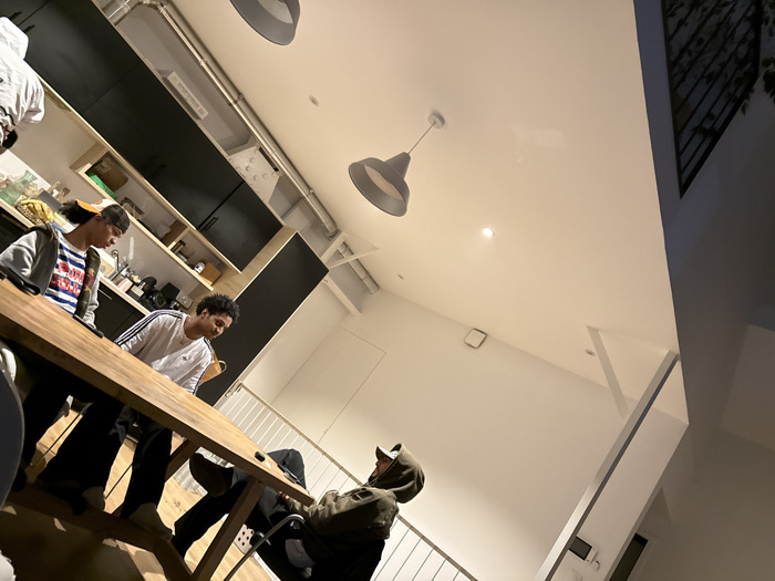 The scene depicts an interior space, identified as being in Saint-Denis, France. The room features high white ceilings, white walls, and bright artificial lighting from multiple recessed spotlights and three grey industrial-style pendant lamps. Three individuals are positioned around a large, rectangular wooden table with a light-colored surface and a darker wooden base. 1. **Person One:** Located on the left, standing. This individual wears a grey hooded jacket over a red, white, and blue horizontally striped shirt, dark pants, and a reversed yellow baseball cap. Their gaze is directed downward towards the table. 2. **Person Two:** Located center-left, standing. This individual wears a white t-shirt with three dark stripes along the sleeves and a small Adidas logo on the chest. They have dark, curly hair and are looking towards Person Three with a slight smile. 3. **Person Three:** Located on the right, seated at the table. This individual wears a dark hooded jacket and a light-colored baseball cap, partially obscured by the table. A fourth individual's shoulder and arm in a white garment are partially visible in the top left corner. In the background, a modern kitchen area is visible, featuring black upper cabinets and light-colored wooden open shelving holding various kitchen items, including a blender, bottles, and a box of cereal. Exposed white pipes or ducts run along the ceiling in the kitchen section. On the right side of the frame, a white-painted metal railing is present, delineating an elevated or sunken section of the room. The floor beneath the table appears to be light-colored wood.