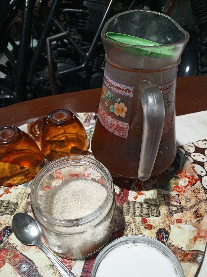 The scene is set on a wooden tabletop in Longmiang, Laos, displaying various items arranged on a patterned placemat. A clear glass pitcher, decorated with an orange floral and red geometric band, is partially filled with a dark brown liquid, likely a beverage. A green plastic stirrer or spoon rests inside the pitcher, submerged in the liquid. Two inverted, amber-tinted glass cups are positioned to the left of the pitcher. A clear glass jar, open and filled with white granulated sugar, is located in the foreground. A silver-colored spoon with an embossed handle lies next to the sugar jar. A white, circular lid is visible in the lower right foreground. The placemat features a collage of designs, including illustrations of the Eiffel Tower, Big Ben, the Leaning Tower of Pisa, butterflies, and text snippets like "Paris" and "London." In the blurred background, dark metal structures, consistent with a motorcycle or bicycle frame, are discernible. There are no individuals present in the frame.