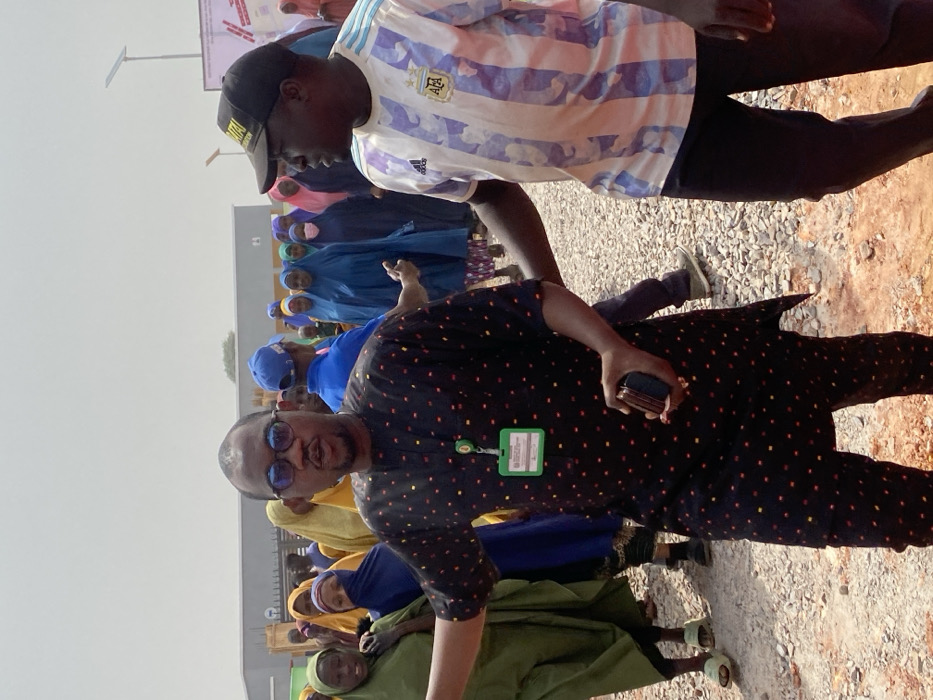 The scene depicts an outdoor gathering in the city of Afaka, Nigeria, under bright, hazy daylight conditions. In the immediate foreground, a male individual with light brown skin, wearing dark-rimmed circular eyeglasses and a black traditional tunic and trousers adorned with small, multi-colored dot patterns, faces slightly left while extending his left arm outwards in a gesture. A green rectangular identification badge is suspended from a lanyard around his neck. He holds a brown wallet or phone in his right hand. To his right, partially visible, stands another male individual with dark skin, wearing a black baseball cap with yellow text and a light blue and white striped Adidas t-shirt featuring the Argentina national football team crest. Behind these two individuals, a crowd of approximately 30-50 people is present, predominantly consisting of women wearing various colored hijabs or head coverings (including blue, green, yellow, and pink). One person in the midground wears a light blue face mask. A male individual in a blue cap and shirt is also visible within the crowd. The ground is composed of light grey gravel mixed with reddish-brown soil. In the background, a modern, grey industrial-style building is visible. Two tall poles equipped with solar light fixtures are present on the right side of the background, and a large red and white banner or sign is partially visible beyond them. The sky is uniformly light and hazy.