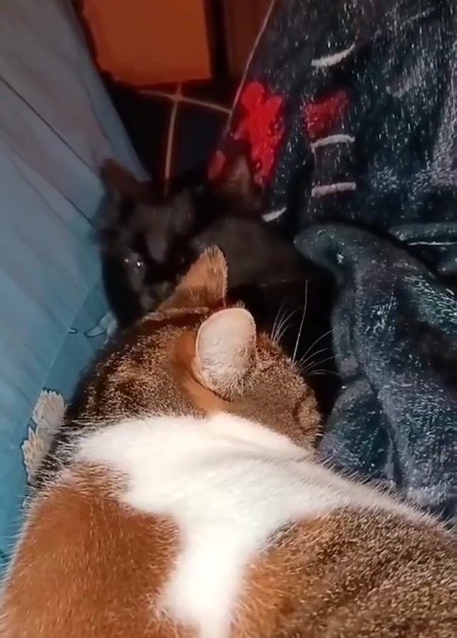 - "two cats, one with black fur and the other with brown and white fur, lying on a light blue patterned surface" by FM-Fezcd2, licensed under CC BY 4.0