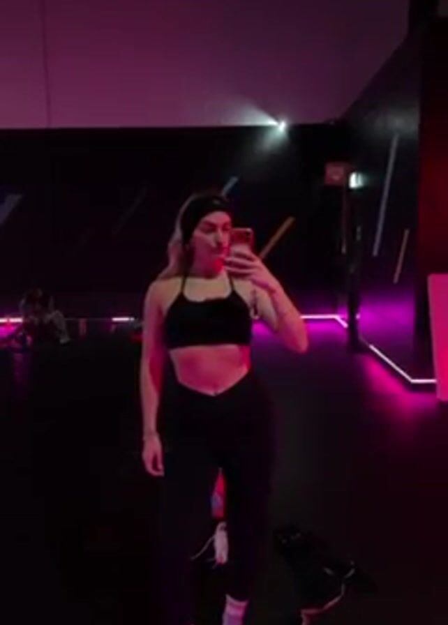 A young woman is taking a selfie in a gym. She is wearing a black sports bra and leggings, along with a black headband. The gym has a dark color scheme with pink neon lighting. Other people are faintly visible in the background. The woman poses slightly while holding her phone.