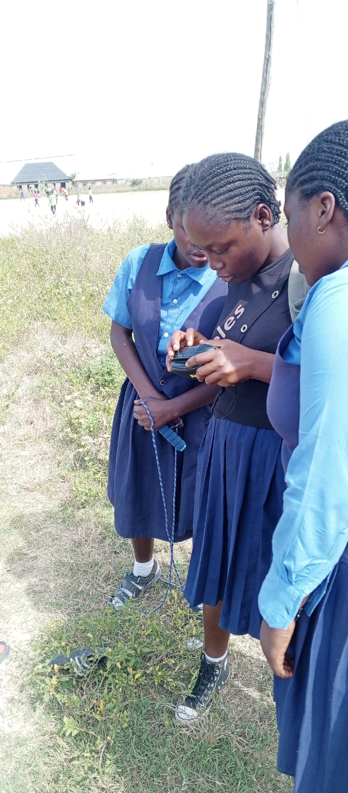 Three young females stand on dry, patchy grass in Kakau, Nigeria, facing towards the right foreground. The central female, wearing a black top, dark blue pleated skirt, and black high-top sneakers, holds a black, circular handheld device in both hands, actively manipulating its buttons. To her left, another female in a light blue shirt, dark blue vest and skirt, and grey sandals, holds a blue and white patterned jump rope with a teal handle in her right hand, looking towards the device. The third female, partially visible on the right, wears a light blue shirt, dark blue vest and skirt, and observes the device. All three have dark braided hair. In the midground, a dirt field contains multiple smaller figures, possibly children, engaged in activity. A one-story building with a dark, sloped roof is visible in the background, along with a slender wooden pole on the right. The sky is bright and appears overcast.