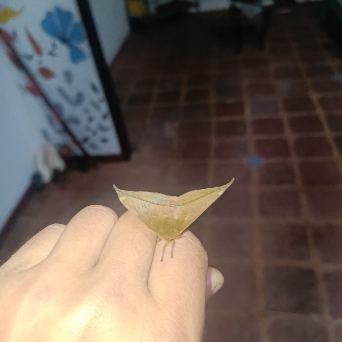 The image captures an indoor scene in Los Velásquez, Venezuela. In the foreground, a light-skinned human hand is positioned horizontally, with its dorsal surface visible. Resting on the knuckles of the hand is a light brown insect, identified as a moth, characterized by its wings held together in a triangular configuration, mimicking a dried leaf. Visible veins delineate the wings, and its slender legs are in contact with the skin of the hand. The background, largely out of focus, reveals a floor composed of reddish-brown square tiles. To the left of the frame, a segment of a white wall displays a dark-framed item with blue and white abstract or floral patterns. The environment appears dimly lit, with primary illumination on the immediate foreground subjects.