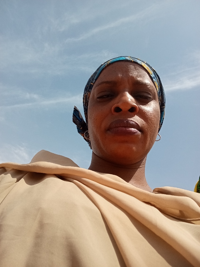 A low-angle outdoor portrait depicts an adult female, located in Kakau, Nigeria