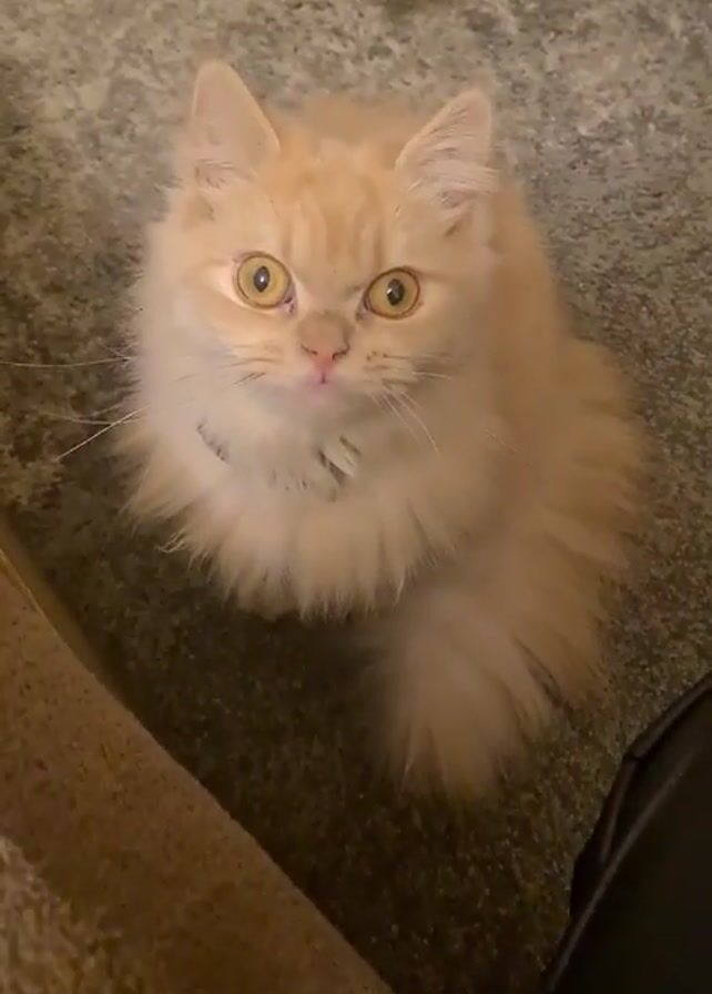 A medium shot shows a fluffy, light-orange cat sitting on a gray carpet