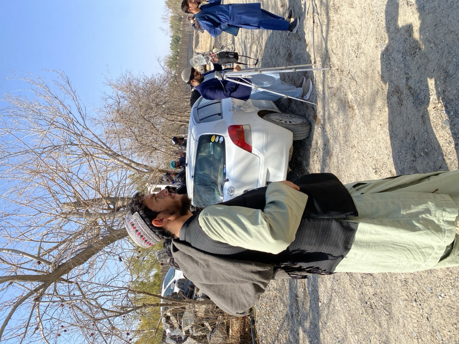 A man in traditional clothing, including a pakol hat and vest, stands outdoors. Behind him, a white car is parked next to bare trees. Further back, two men operate a camera on a tripod, while another man in a blue robe stands nearby. The ground is gravelly and the sky is clear. Shadows are cast by figures in the scene.