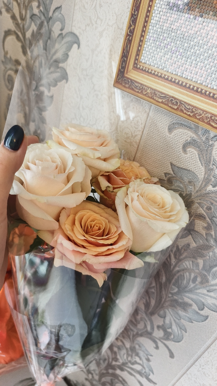 A close-up image depicts a bouquet of approximately seven to eight roses, primarily in shades of light peach, cream, and soft orange, wrapped in clear plastic cellophane. A left hand, featuring a dark-colored manicure, is visible in the upper left quadrant, holding the bouquet. The background consists of patterned wallpaper with a light beige or cream base and ornate, greyish-blue scrollwork or floral motifs. In the upper right corner, a portion of a framed object is visible; it appears to be a diamond painting or mosaic art piece with a grid of sparkling, multi-colored squares, set within an ornate gold-colored frame. The scene is located indoors in Chaikovsky, Russia.