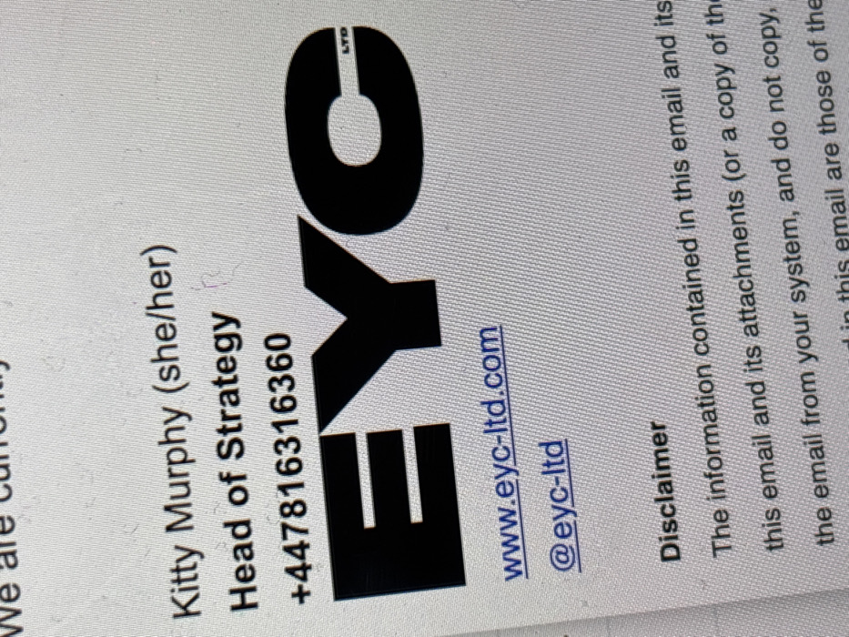 This image is a close-up, slightly angled photograph of a digital screen displaying an email signature. The screen exhibits visible pixelation and a slight grid pattern characteristic of a digital monitor. The primary subject is black text on a light gray background. Key details visible include the name "Kitty Murphy (she/her)," identified as "Head of Strategy," followed by a contact number "+447816316360." Below this is a large, black, sans-serif logo spelling "EYC," with the letters "LTD" in smaller type positioned within the right curve of the 'C'. Further contact information includes a blue, underlined website address "www.eyc-ltd.com" and an @handle "@eyc-ltd." The text concludes with a partially visible disclaimer section, beginning with the bolded word "Disclaimer" and the first lines: "The information contained in this email and its attachments (or a copy of the email from your system, and do not copy,." No individuals are present in the image, nor are any specific actions or interactions depicted. The environment is limited to the digital display itself, suggesting an indoor setting where a screen is in use. While the contact number includes a UK country code (+44), the image provides no specific visual or textual information to pinpoint a precise location within the city of Tunbridge Wells, United Kingdom.