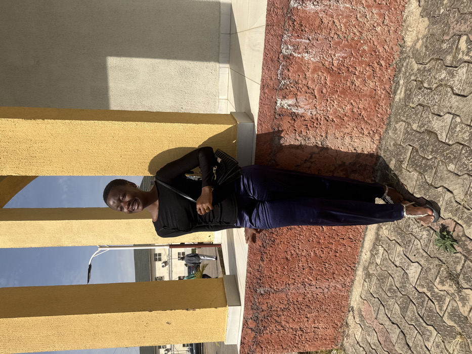 A young adult female is depicted standing outdoors in the city of Jos, Nigeria. She has short dark hair and a dark complexion, smiling while looking towards the left side of the frame. She is dressed in a black long-sleeved top, dark blue wide-leg trousers, and white flat sandals, with a black quilted handbag draped over her right shoulder. Her left arm rests on a textured, reddish-brown low wall. Behind her are two yellow-painted rectangular pillars, positioned adjacent to a light-colored building wall that exhibits distinct shadows cast by the pillars. The ground beneath her feet consists of grey interlocking paving blocks, with a small green plant visible between the blocks. In the background, under a clear blue sky, a streetlamp, a multi-story building with a green roof, and a distant individual walking are discernible. The scene is illuminated by bright, direct sunlight, creating sharp shadows.