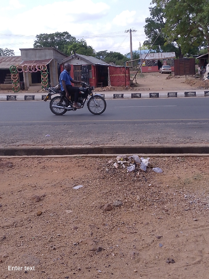 An outdoor scene in Adankolo, Nigeria, depicts a daytime environment under an overcast sky. A dark-skinned adult male, wearing a blue collared shirt and dark trousers, operates a black motorcycle on a two-lane asphalt road. He is barefoot. The motorcycle features silver exhaust and spoked wheels. The road has a median strip marked by alternating white and black concrete blocks. To the left and right of the road, the ground is unpaved, consisting of reddish-brown earth mixed with gravel and small rocks. In the foreground, a pile of white plastic refuse is visible on this unpaved area. In the background, on the far side of the road, a series of single-story, rudimentary structures line the street. The leftmost building has a corrugated metal roof and displays a stack of circular, multi-colored objects on its exterior. Adjacent structures feature corrugated metal roofs and walls, some painted red with horizontal patterns. Green tree foliage is visible above and behind these buildings. A light-colored sedan is parked near one of the background structures on the right. Utility poles with overhead wires are also present in the background.