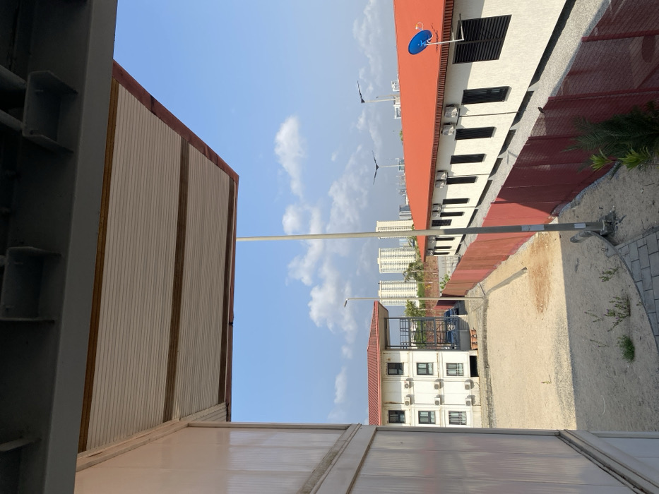 The image depicts an outdoor daytime scene in Inupa Kekere, Nigeria, viewed from an elevated perspective. The upper foreground shows the underside of a white corrugated metal awning, bordered by a brown trim, supported by a grey structural I-beam, and part of a white corrugated wall on the left. The midground features an unpaved, sandy-colored ground area with sparse vegetation and a segment of grey paver stones. A tall, grey utility pole with a modern LED street light fixture stands vertically near the center. A red corrugated metal fence runs horizontally, separating the sandy area from a property on the right. To the left, a paved road or driveway is visible with a dark-colored vehicle partially obscured. Two buildings are prominent: On the left, a white, two-story building with a red pitched roof, multiple rectangular windows, and external air conditioning units. It has an open metal staircase and landing structure on its right side. On the right, beyond the fence, a single-story white building with a red pitched roof, multiple rectangular windows with dark shutters, and external air conditioning units. A blue satellite dish is mounted on its right facade. The background consists of a clear blue sky with scattered white cumulus clouds. Several additional tall poles with modern LED street light fixtures are distributed across the landscape. In the distant background, a cluster of approximately three light-colored high-rise buildings is visible, indicative of urban development. No individuals are present in the depicted scene.