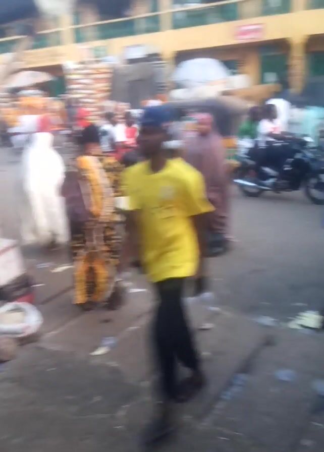 n outdoor market scene, likely in an urban area. There are people walking around, some are dressed in traditional clothing. A blue truck is parked near stalls selling various goods. Merchandise is displayed on tables and shelves, including bags of produce and other items. The ground is littered with trash. The buildings in the background have a yellow facade. The camera moves, showing different parts of the market.